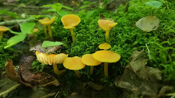 Later in the season, under the dense shade of the forest canopy, various mushrooms and the pale Coral Root Orchid appear. The old trees and undisturbed ground are covered with dense growths of lichens, mosses and ferns.