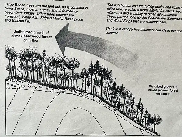 Large Beech trees are present but, as is common in Nova Scotia, most are small and deformed by beech-bark fungus. Other trees present are Ironwood, White Ash, Striped Maple, Red Spruce and Balsam Fir.